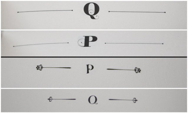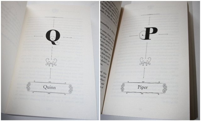 Gemeinsam haben beide Bücher, dass sie am oberen Seitenrand je nach Erzählerin ein eingerahmtes Q oder P haben. Hier werden jeweils die gleiche Schriftart wie auf dem Cover dafür verwendet. Aus die beiden Striche lehnen sich an den Beginn des Kapitels an. Die englische Ausgabe bedient sich der geraden Striche mit jeweils einem Punkt am Ende, während im Deutschen sich verjüngende Striche mit Ornament am Ende abgedruckt wurden.